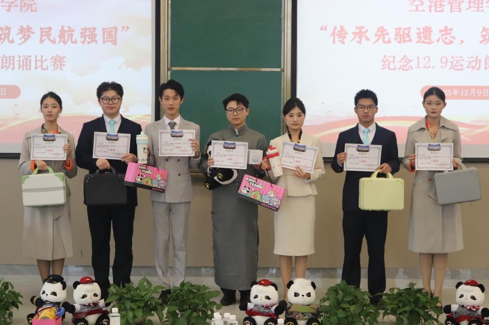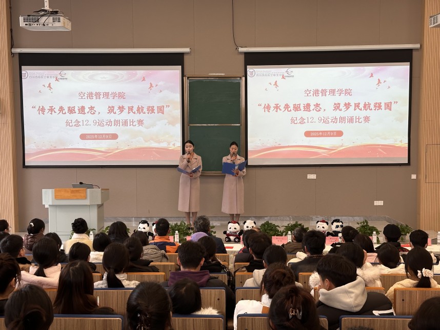 “我和我的祖国,一刻也不能分割……”,在师生们深情的歌声中,空港管理学院党总支纪念“12·9”爱国运动拉开了序幕。2025年12月9日下午,空港管理学院党总支在C112隆重举行第三届“传承先驱遗志 筑梦民航强国”纪念“一二·九”运动诗歌朗诵比赛。学院党委岳文喜书记、苟平德副院长、空港管理学院李青松院长、党委宣传部邹航副部长等领导出席活动,空港管理学院部分师生代表参加。本次朗诵比赛以声音为媒介,以历史为教材,以精神为纽带,深化了爱国主义教育和思想政治教育内涵,激励了全体西航学子不忘初心、牢记使命,在新时代民航事业发展中展现新作为、作出新贡献。