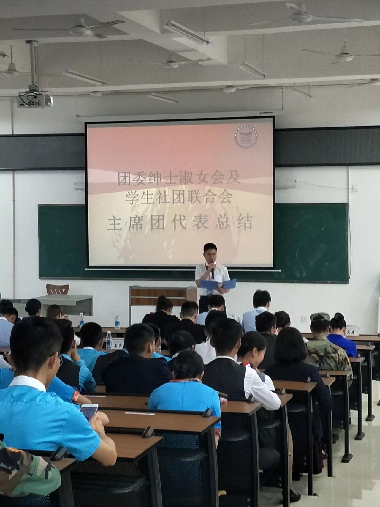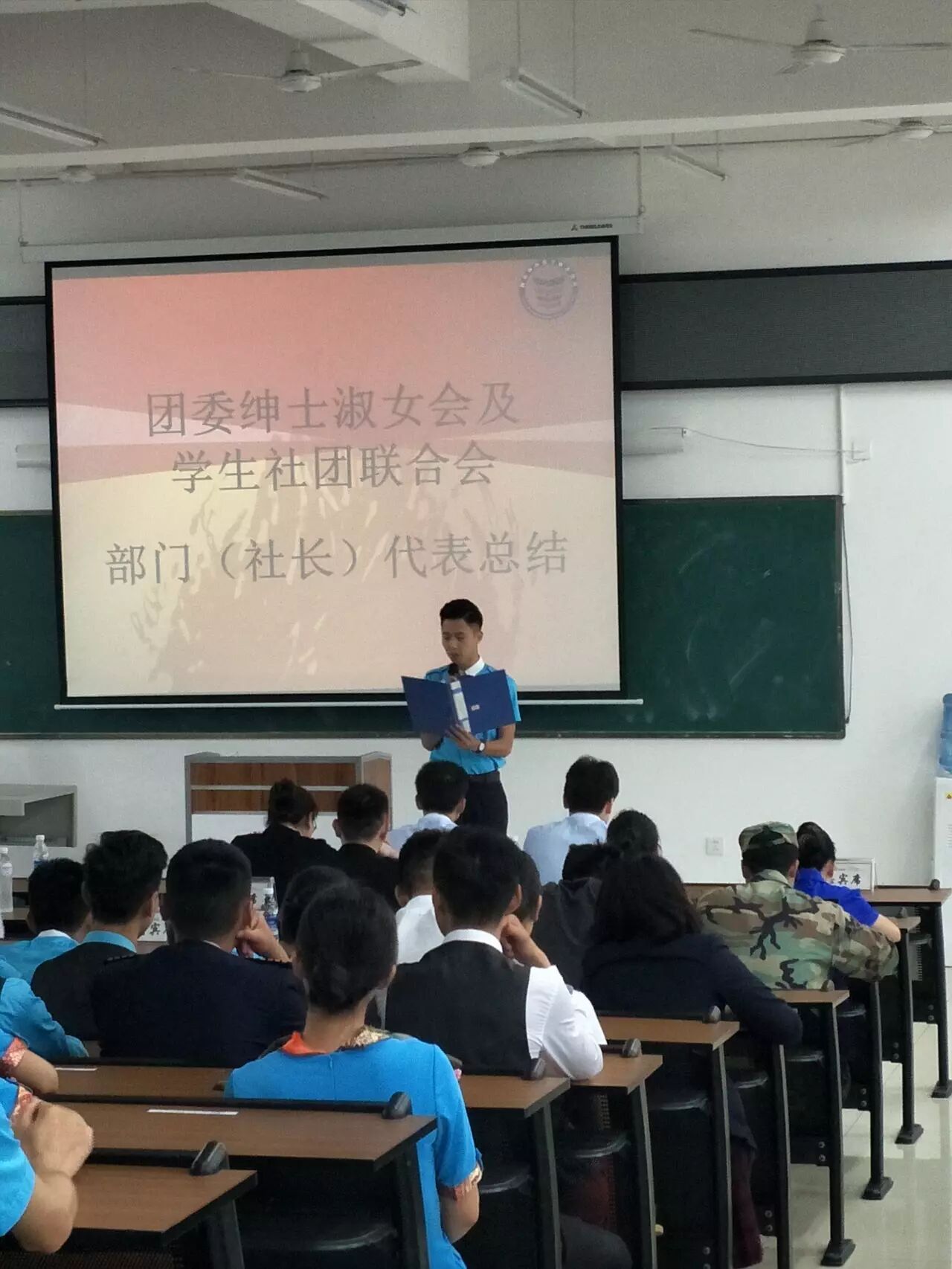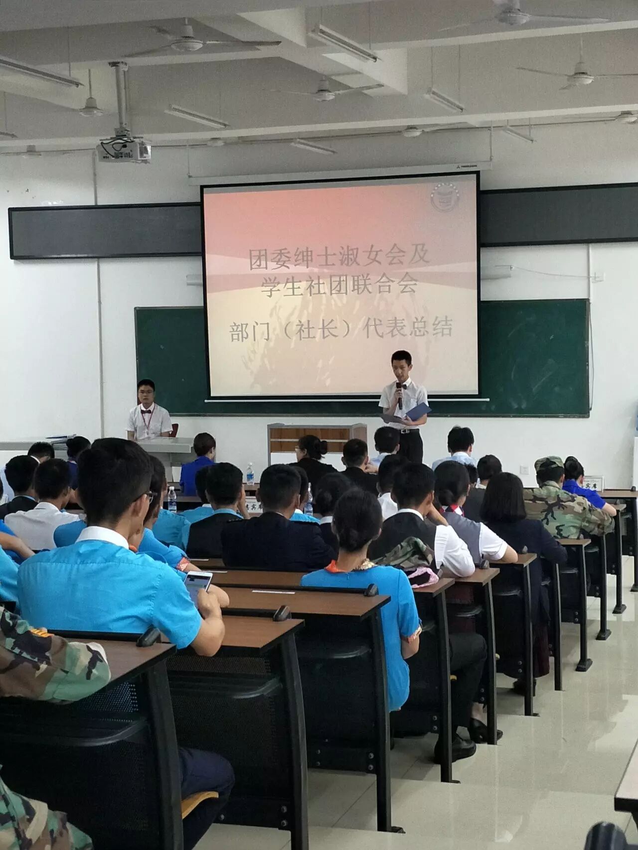 2017年6月14日晚6:30,学生会(绅士淑女会)、社团联合会总结大会在一教223隆重举行。院团委书记樊帆女士、团委专职干事沈雪老师、团委兼职干事王诗瑶老师、学生处兼职干事杜玖钦老师、学生处职员张珊老师、安保处干事易启洪老师、教务处职员肖金保老师及各社团指导老师们出席了本次大会。