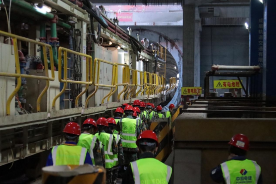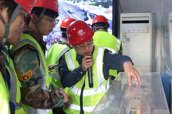 座谈会后,师生分为两批,在企业讲解人员的引导下,交叉参观成眉线地铁秦皇寺站施工现场。学生规范佩戴安全防护装备,有序进入施工区域,近距离观摩被誉为“地下巨龙”的盾构机,详细了解其刀盘掘进、管片拼装、渣土输送等全流程作业原理。在工程监控室,大家见证了“掘进参数调节”“姿态校正”等关键操作,深刻体会到轨道交通建设“差之毫厘,谬以千里”的专业严谨性。技术人员还带领学生参观隧道施工模拟展区,并结合实际场景讲解施工工艺、设备操作与质量控制要点,使学生对“安全第一、质量至上”的理念有了更深理解。