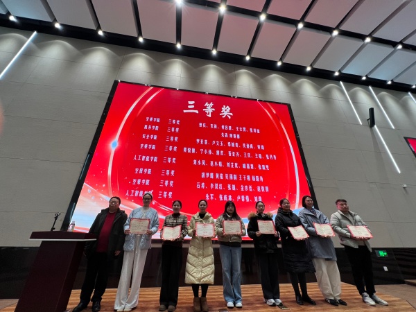 随后,会议举行学院首届AI助教创新大赛颁奖仪式。学院副院长饶国清教授、李珊珊教授与马克思主义学院院长杨文清教授共同为获奖团队颁发荣誉证书。本次大赛是学院推动人工智能技术与教育教学深度融合的重要举措,旨在鼓励教师积极探索智能工具辅助教学的新模式、新方法,不断提升教学效能与学生体验。获奖作品集中展示了我院教师在信息化教学创新方面的积极尝试与阶段性成果。