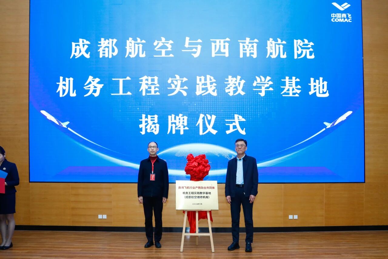 会议期间,“成都航空——四川西南航空职业学院机务工程实践教学基地”正式揭牌。我院机务学院副院长、商用飞机产业学院副院长谭浩与成都航空有限公司人力资源部总经理王海涛共同为基地揭牌。该基地的建立,是对产业学院成立时“共建实训基地”承诺的具体落实,旨在将企业真实生产环境转化为常态化教学场景,是校企协同培养实战型机务人才的关键一步。