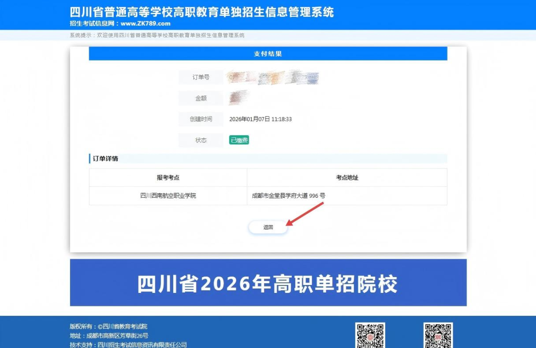 10、在图1支付结果页面点击“返回”按钮,进入查看报名信息页面如图2所示。