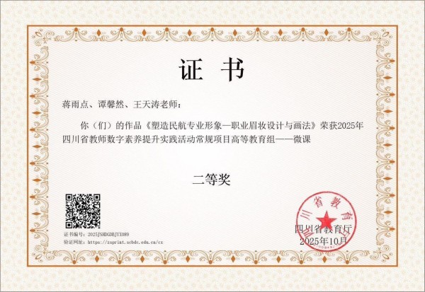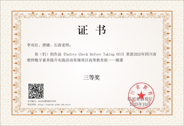由空中乘务学院李双红、唐婕、石涛教师组成战队共同参赛,作品荣获四川省教师数字素养提升实践活动常规项目高等教育组微课三等奖。