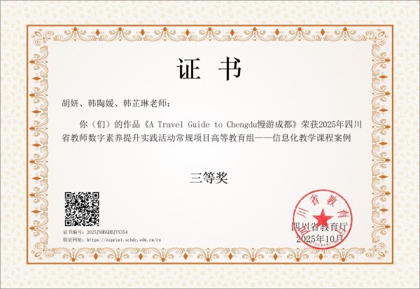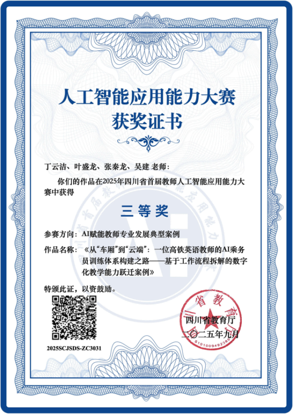 在2025年四川省首届教师人工智能应用能力大赛中,我院吴建老师参与团队荣获三等奖,展现出AI与教育融合的前沿探索。