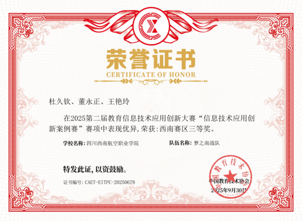 此外,我院杜久钦老师与董永正、王艳玲老师在2025第二届教育信息技术应用创新大赛中,荣获西南赛区三等奖,体现实战型信息技术应用的扎实能力。