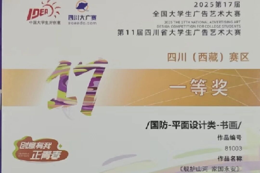 ?近日,从两项省级赛事中接连传来喜讯——我院空乘专业学生钟润希创作的国防主题绘画作品《舰护山河 家国永安》脱颖而出,先后荣获第17届全国大学生广告艺术大赛四川(西藏)赛区一等奖和2025年四川省首届“爱我国防”文化创意大赛优秀奖,充分展现了我院学子卓越的艺术创作能力和深厚的家国情怀。