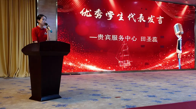 会上,四川西南航空职业学院19级空乘专业7班田圣蕊作为学生代表发言。已成长为贵宾厅明星班组长的她,向新入职同学分享了两点心得:一是把小事做到极致,比如从整理好制服上的一颗纽扣开始;二是正视问题即契机,工作中的小插曲正是改进提升的突破口。