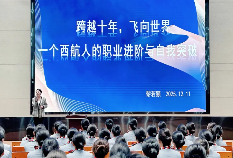 讲座中,黎若颖学姐结合自身的成长轨迹,向学弟学妹们提出真挚嘱托。从国内航司到国际舞台,黎若颖的每一步都彰显着“敢梦敢飞”的西航人精神。她以亲身经历诠释了坚持与学习的意义,为在校学子描绘出一幅清晰而充满可能的职业发展图景。
