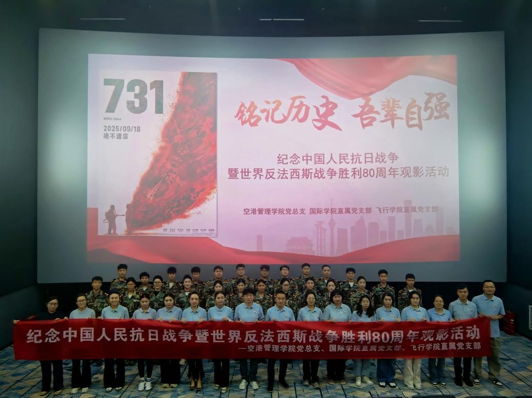 为纪念中国人民抗日战争暨世界反法西斯战争胜利80周年,深入开展爱国主义教育,9月24日13:30,空港管理学院党总支、国际学院直属党支部、飞行学院直属党支部联合组织全体教师党员、学生党员和部分入党积极分子赴甘御兰万达影城,集体观看历史影片《731》。