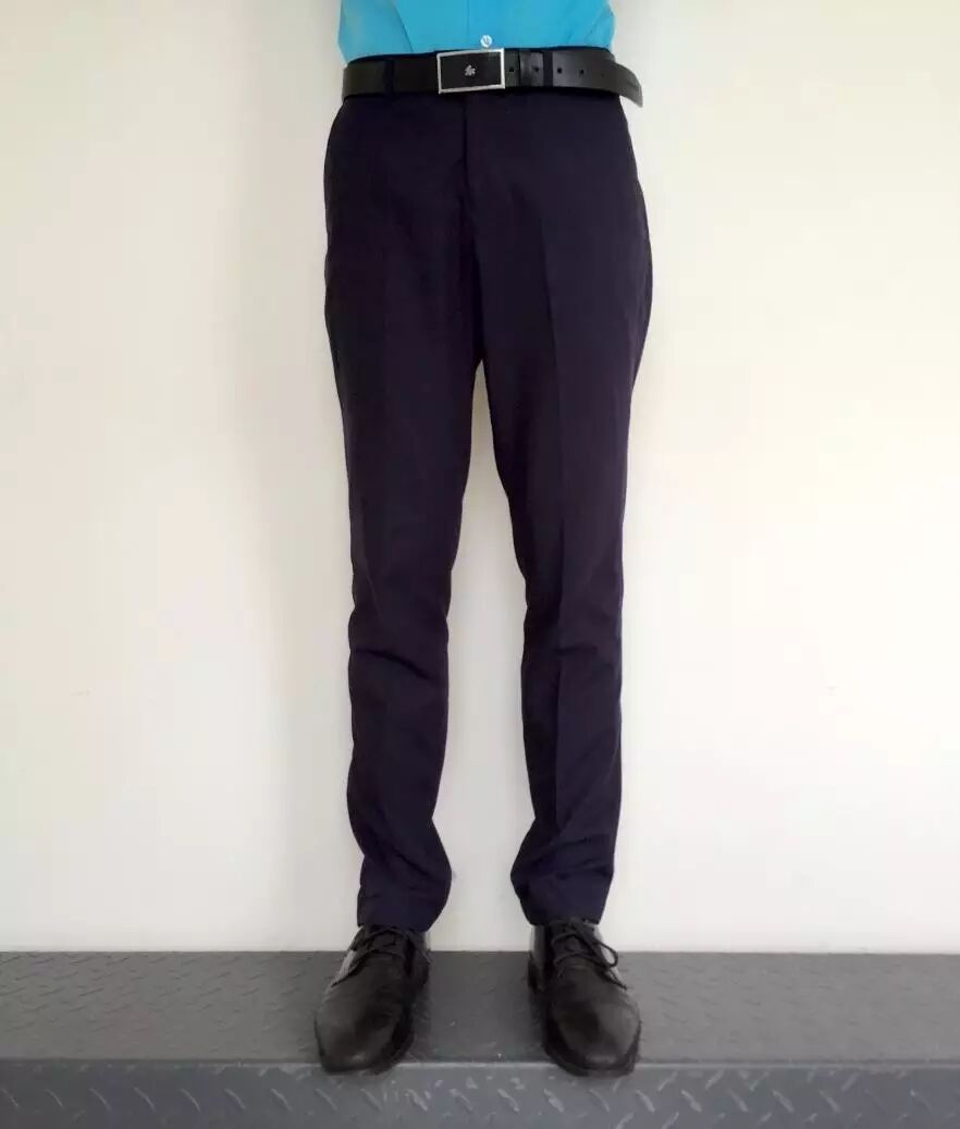 (4)西裤宽松适度,长度以刚好盖住鞋面为宜,不得过短或过长。