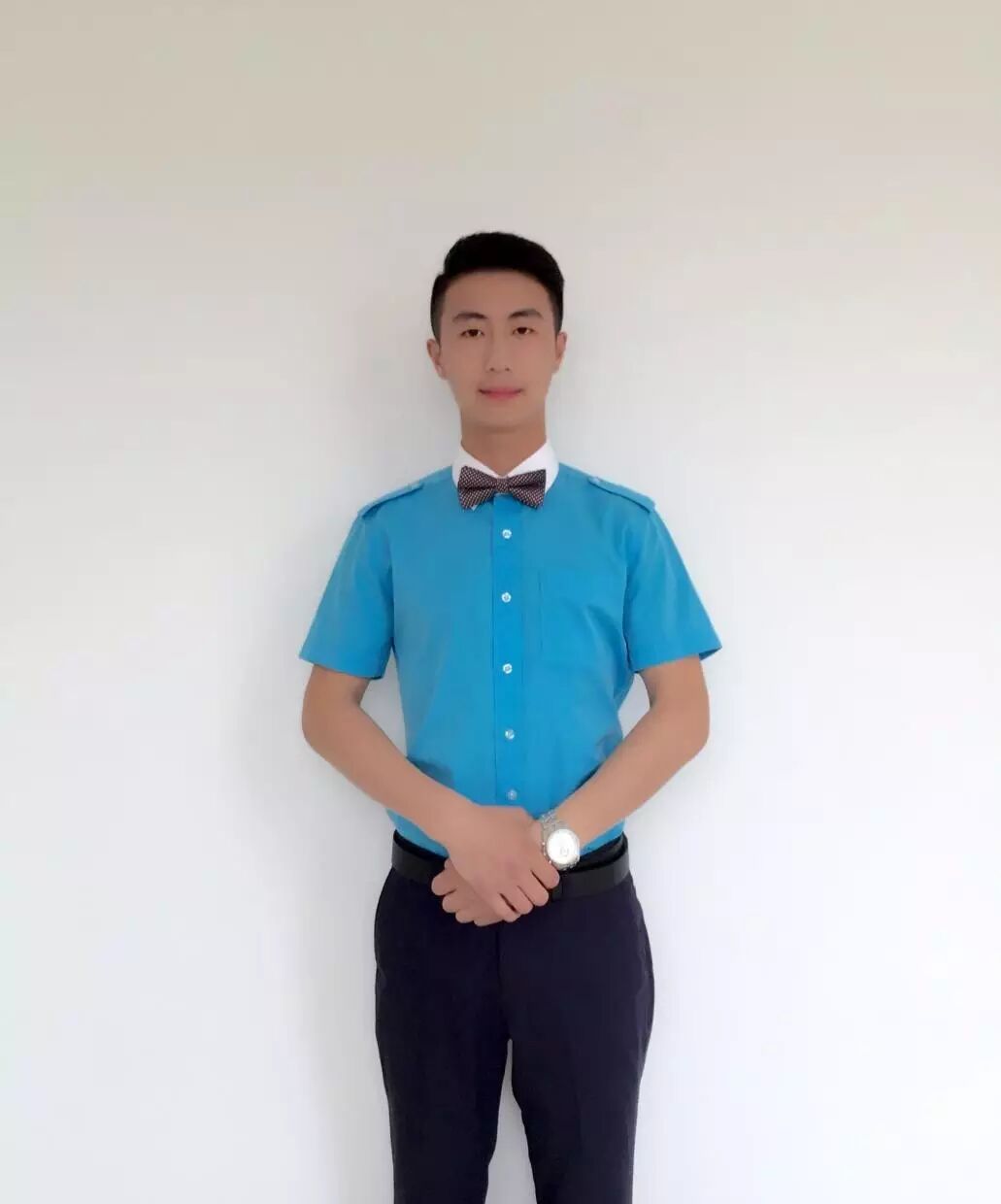 (1)着短袖衬衣,衬衣熨烫平整,无褶皱压痕,干净无渍。