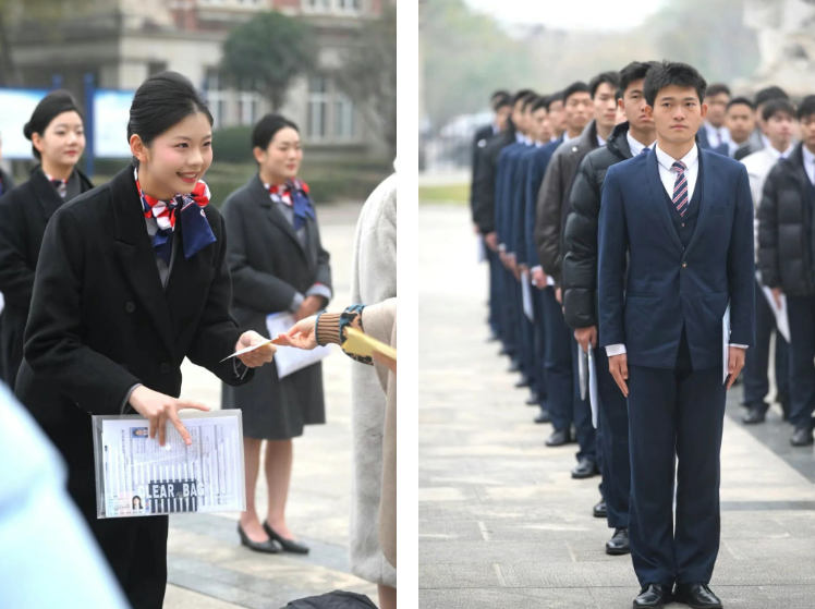 候场等待秩序井然,怀揣蓝天梦想的西航学子们正从容备战。大家身着笔挺职业装,妆容精致得体,有的轻声梳理面试要点,有的相互整理服饰细节,始终保持着挺拔站姿与饱满精神状态。