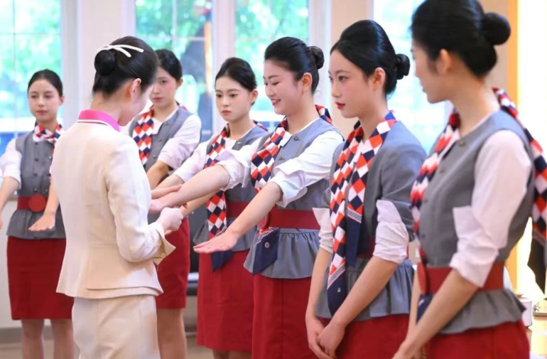 海选环节聚焦职业形象初筛,面试官以 “第一印象” 为核心,重点考察学生们的仪容仪表与体型体态。同学们有序列队,身着整洁挺括的职业装,搭配精致得体的妆容,站姿挺拔、精神饱满,举手投足间尽显 “高度职业化民航员工” 的西航风采。
