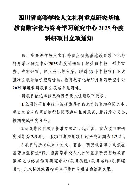 近日,四川省高等学校人文社科重点研究基地教育数字化与终身学习研究中心公布2025年度科研项目立项结果,我院胡伟老师申报的课题《数字化转型背景下“家校社”体教融合协同育人模式的创新与实践研究》(DELL2025YY-07)获批立项。