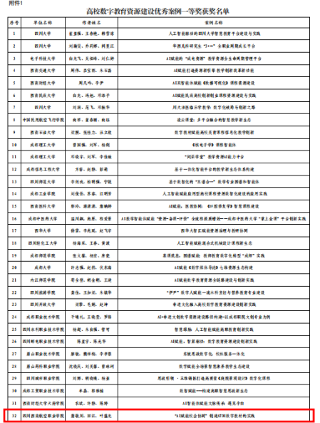 近日,四川省教育信息化与大数据中心(四川省电化教育馆)公布2025年“高校数字教育资源建设”优秀案例评选结果,获得优秀案例“一等奖”的院校共有32所院校,其中本科院校24所、高职院校8所(民办高职院校2所)。