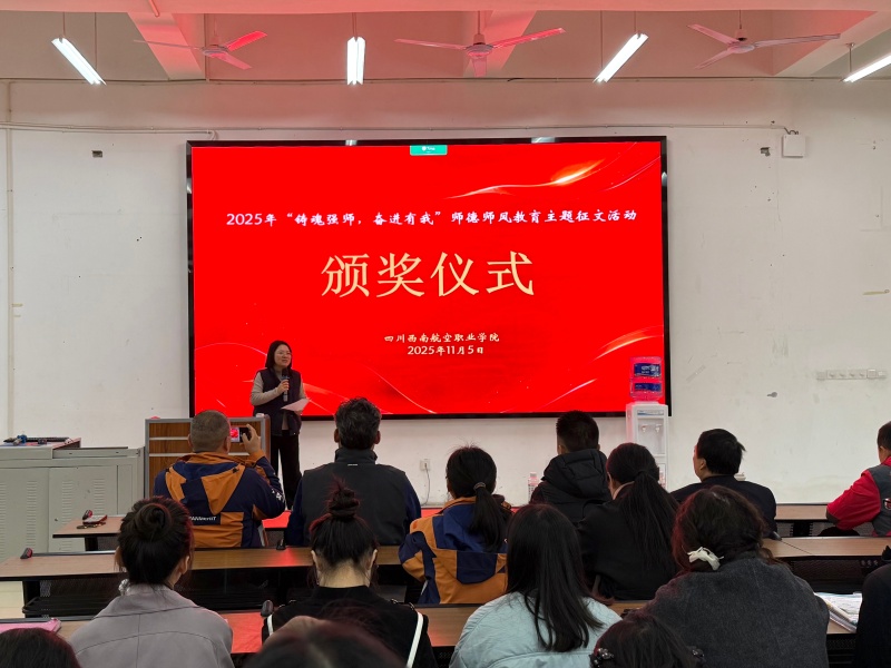 为深入学习贯彻习近平总书记关于教育的重要论述,弘扬新时代教育家精神,将师德师风建设引向深入,2025年11月5日下午,四川西南航空职业学院“铸魂强师,奋进有我”师德师风教育主题征文活动颁奖仪式在1-223阶梯教室隆重举行。学院领导、各二级单位负责人及教师代表齐聚一堂,共同见证这一凝聚师魂、彰显风范的荣誉时刻。