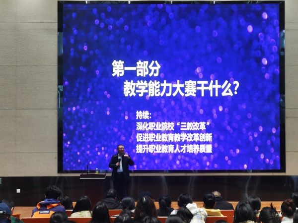 培训环节中,饶国清副院长以“以赛促教,提升质量”为主题,结合比赛内涵与相关文件精神,从赛事准备的关键环节入手,系统阐述了教案设计、教学实施报告撰写、人才培养方案与课程标准衔接、教材选用说明等核心内容的规范与创新要求。培训内容详实、针对性强,为参赛教师厘清了备赛思路,明确了提升路径,充分体现了学院“以赛促教、以赛促改、以赛促建”的育人导向。