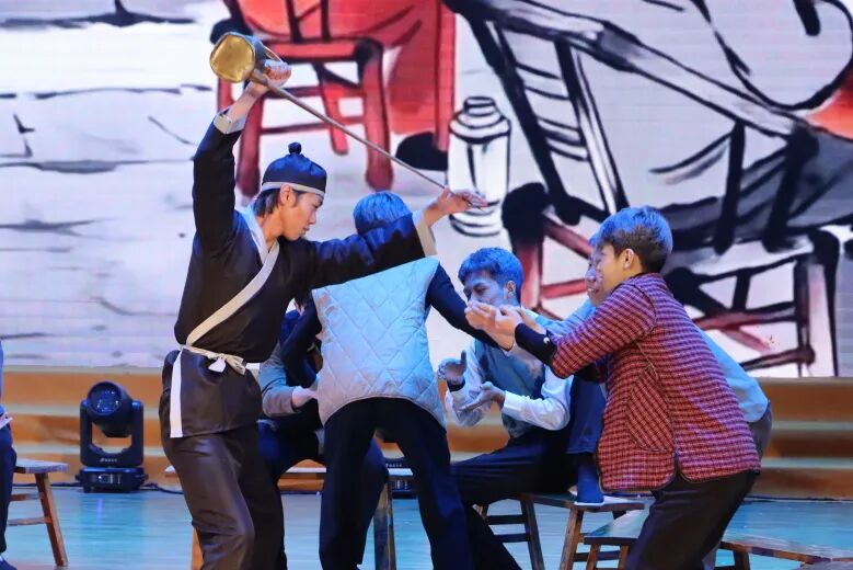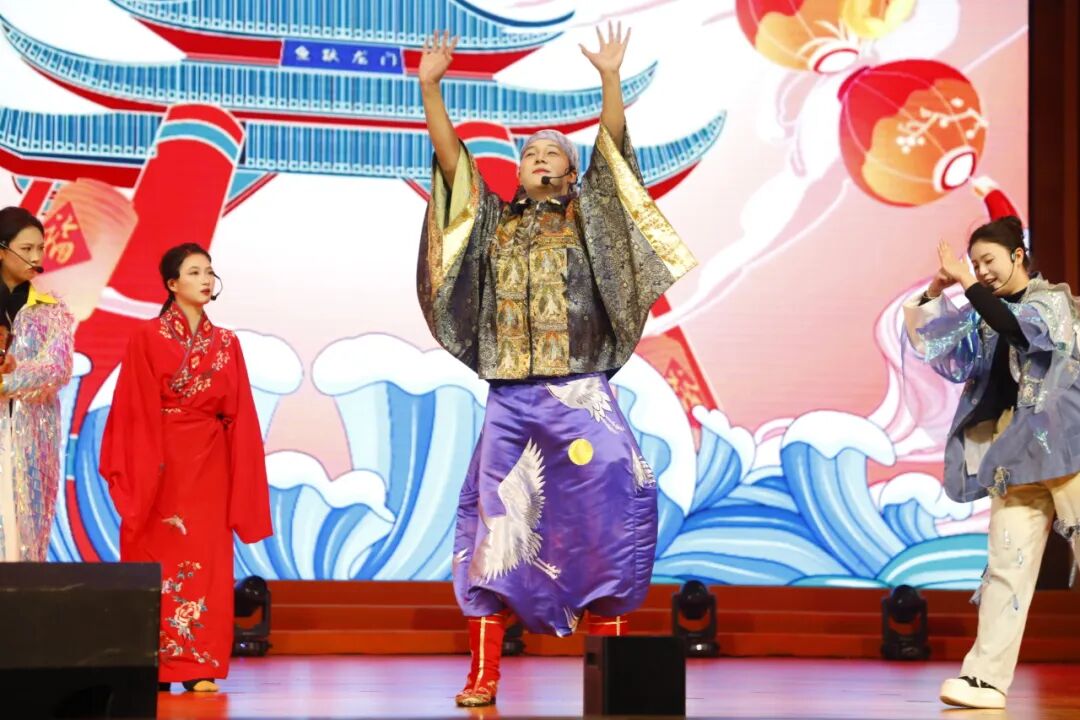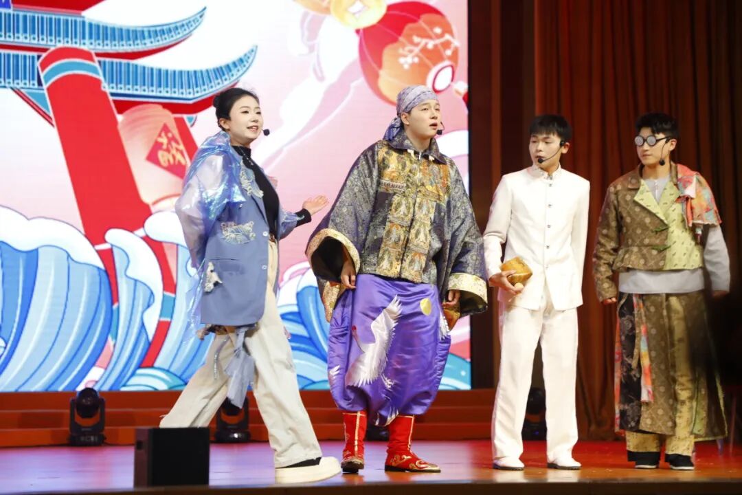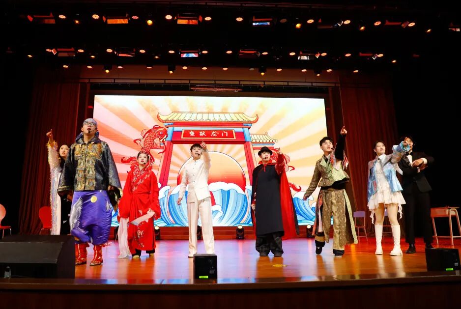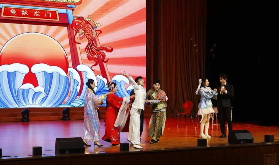 《鱼跃龙门》空中乘务学院指导老师:罗瑞烨 张越,“跳一跳,步步高”学子们的奋斗劲头被他们演绎得入木三分。包袱不断,笑声满场,仿佛所有烦恼都在欢腾中被一脚踢开。在酣畅的表演里,我们看见那份专属于青春的乐观与韧劲——纵身一跃,便是龙门。
