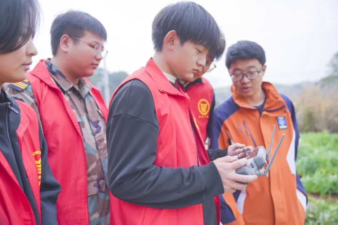 “以前人工打药,背着药箱在花田里走一天都忙不完,现在无人机十几分钟就能搞定一片,又快又均匀!”站在田埂上,白果街道农户看着无人机灵活穿梭的身影,脸上满是笑意。作业现场秩序井然,划分清晰的作业区、警戒区保障着作业安全。飞行学院的师生们分工协作、默契配合:专业教师坐镇指导,学生们则专注于遥控器操控、航线规划,精准调配药剂浓度,同时巡查作业效果、实时调整参数。从课堂上的无人机原理、飞行安全理论,到田间地头的实操演练,师生们将专业知识转化为助农实效,真正实现了“把课堂搬下乡间”。
