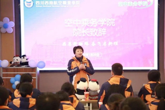 空中乘务学院张雪梅院长在致辞中,衷心感谢集团就业中心的指导与全体辅导员的付出。她强调,就业工作是育人成果的重要体现,2026年以“稳指标、提质量、保底线、创品牌”为主线,继续提升服务品质、优化招聘策略、强化生涯教育,为学生职业生涯铺就坚实道路,也期望学院在新程中再创辉煌。