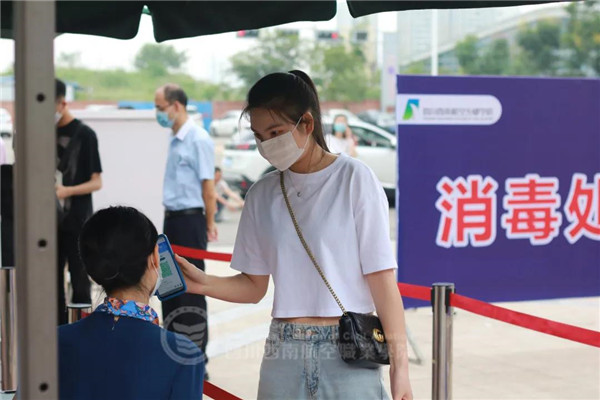 九月的第一个晴天显得格外热闹,西航早已张开双臂迎接同学们的到来。间隔排队通道、体温检测点、物品消毒处、资料审核处……层层“关卡”,只为保障大家能安心入校。