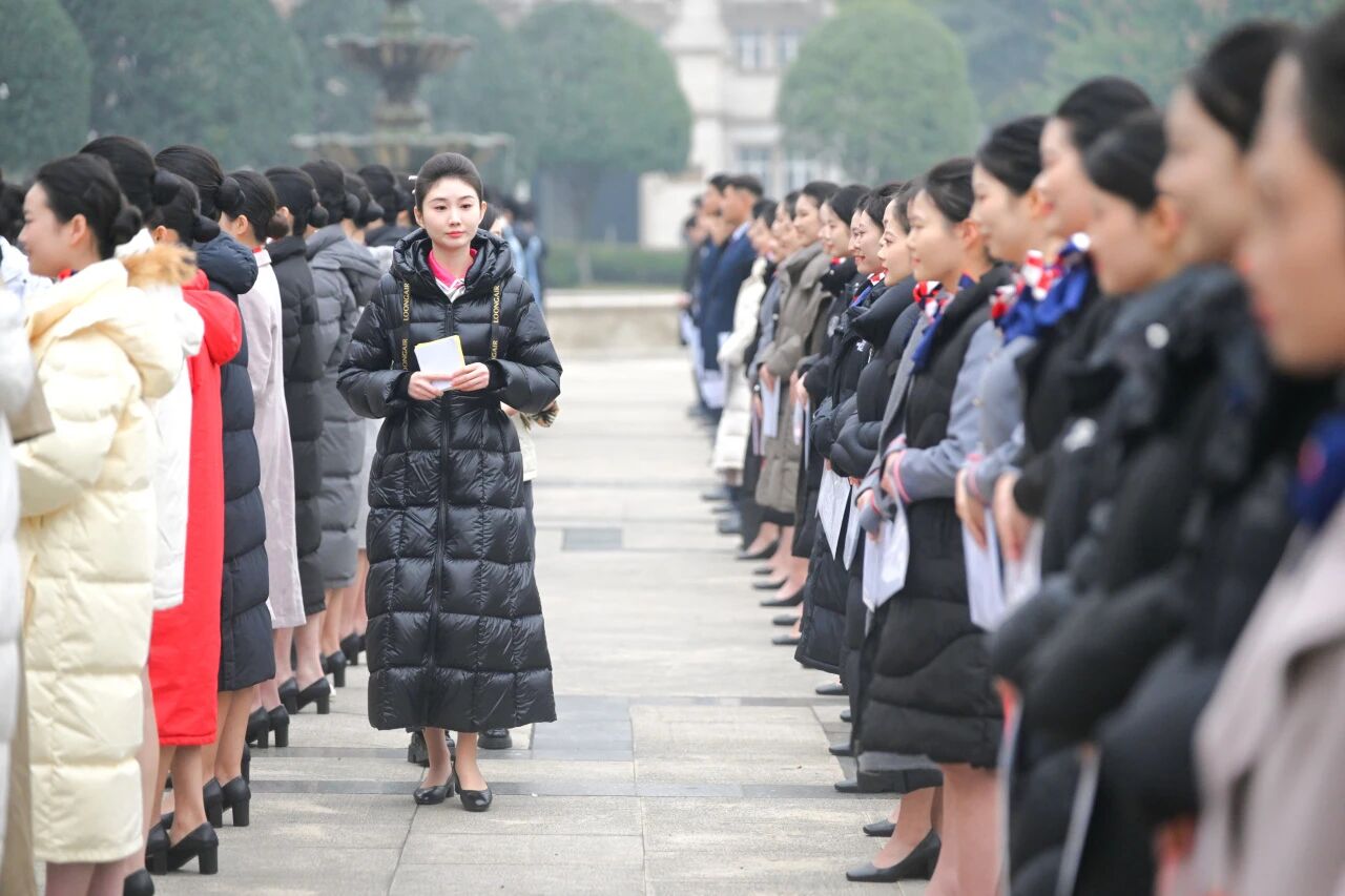 招聘现场,热情与专业交织成这个冬天最动人的画面。西航学子们身着笔挺的职业制服,妆容精致,仪态端庄,无论是在队列中静候,还是在面试中应答,都展现着“高度职业化民航员工”的专业素养。