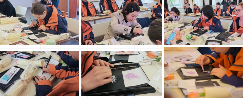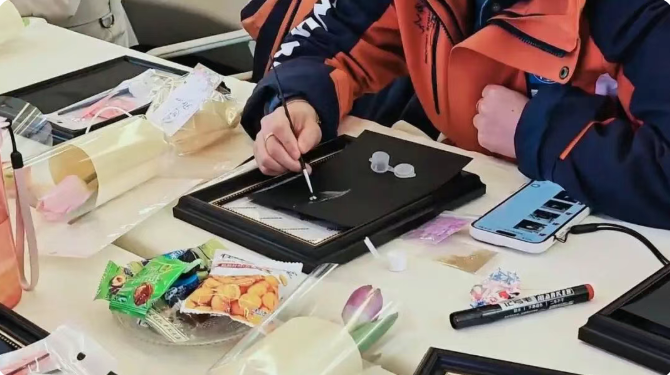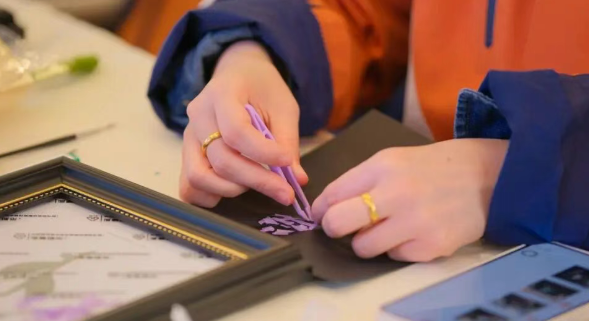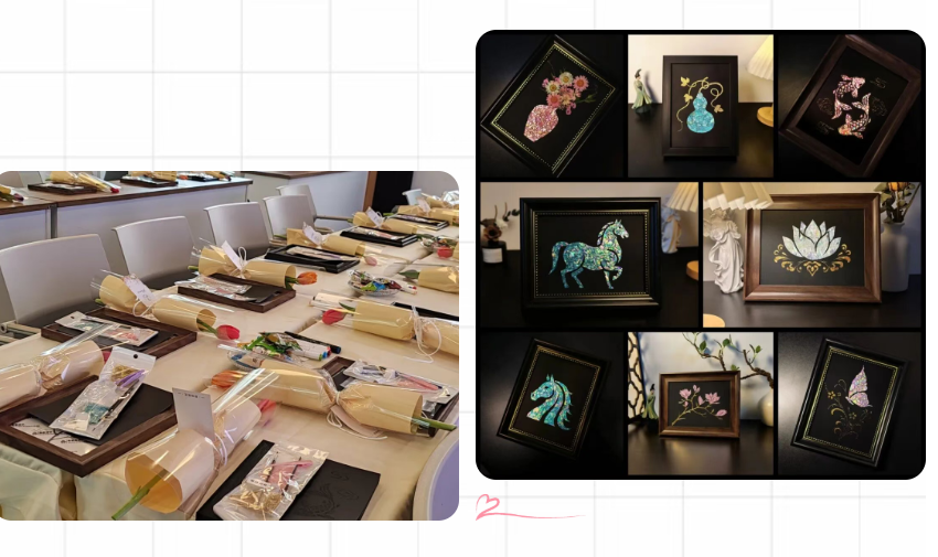 活动的最后,大家静下心来,用色彩与纹样创作属于自己的螺钿贴画。有人选了明亮的黄,有人偏爱温柔的粉,有人用贝壳拼出花朵的模样。每一幅作品,都是此刻心情的表达,也是对自己的温柔馈赠。