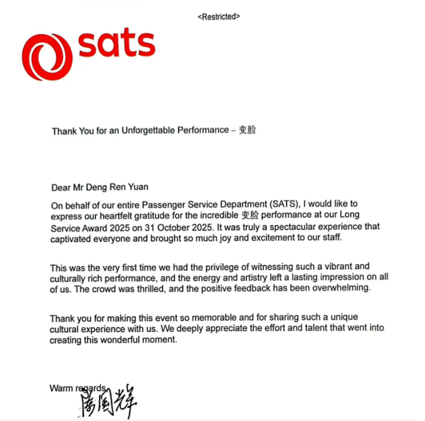 演出后不久,我收到了新翔集团(SATS)的感谢信。信中,向我表达了衷心的感谢,称我的变脸表演“震撼、难忘且充满文化内涵”,是一场“让所有人着迷、为员工带来无尽欢乐与激动的精彩体验”。更让我惊喜的是,集团正式向我发出了明年的演出邀请,希望我能再次前往新加坡,这份认可,是对我最大的鼓励。