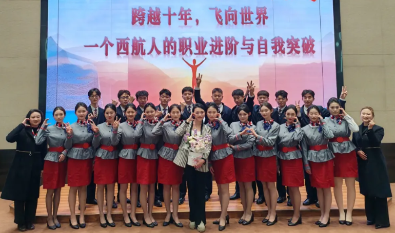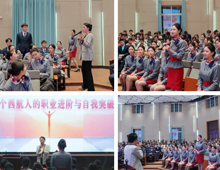 讲座中,黎若颖学姐结合自身的成长轨迹,向学弟学妹们提出真挚嘱托。从国内航司到国际舞台,黎若颖的每一步都彰显着“敢梦敢飞”的西航人精神。她以亲身经历诠释了坚持与学习的意义,为在校学子描绘出一幅清晰而充满可能的职业发展图景。
