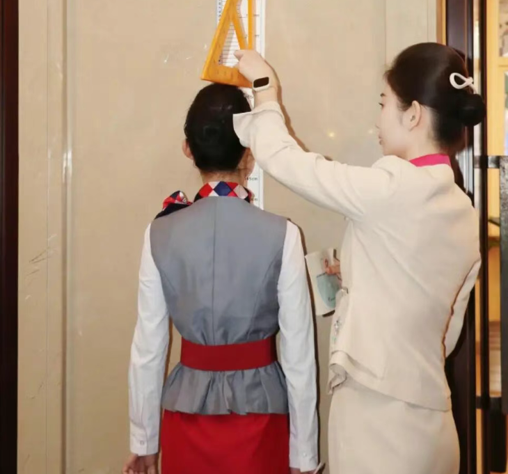 身高测量环节规范有序,是职业形象筛查的重要一环。西航学子们按序排队,自觉脱鞋、以挺胸抬头、双脚并拢的标准姿态依次测量。现场使用专业身高测量仪,工作人员严谨记录数据,全程公开透明。