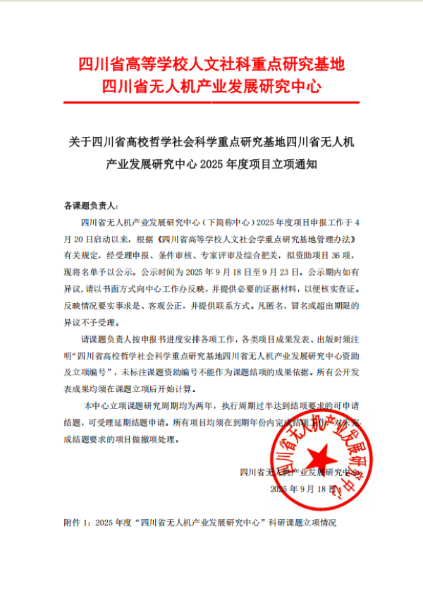 近日,我院2项课题获批四川省高校哲学社会科学重点研究基地四川省无人机产业发展研究中心2025年度项目立项,名单如下: