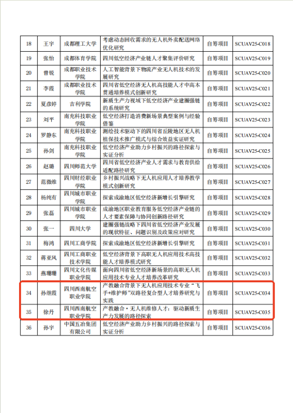 1.课题负责人:孙继霞——《产教融合背景下无人机应用技术专业“飞手+维护师”双路径复合型人才培养研究与实践》(SCUAV25-C034)