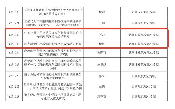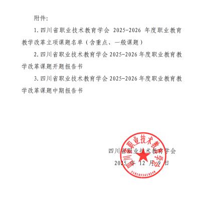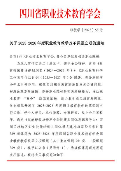 近日,四川职业技术教育学会公布2025-2026年度职业教育教学改革课题立项结果,我院2项课题获批立项,名单如下:
