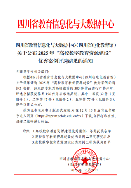 近日,四川省教育信息化与大数据中心(四川省电化教育馆)公布2025年“高校数字教育资源建设”优秀案例评选结果,获得优秀案例“一等奖”的院校共有32所院校,其中本科院校24所、高职院校8所(民办高职院校2所)。