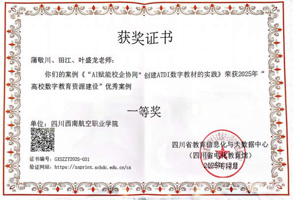 西南航院(集团云中心)依托泛美教育APP新升级的AI数字教材平台,由蒲敬川、田江、叶盛龙老师申报的案例《“AI赋能校企协同”创建ATDI数字教材的实践》,荣获了“2025高校数字教育资源建设”优秀案例“一等奖”。