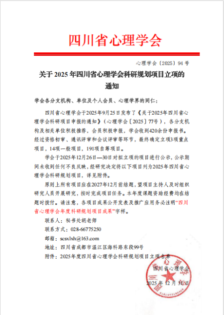 近日,2025年四川省心理学会科研规划项目立项结果公布,我院2项课题获批立项,名单如下: