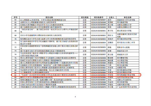 1.课题负责人:李佳锐——《“生命树”艺术治疗团体对抑郁大学生自杀意念的干预效果研究》(SCSXLXH20250306)
