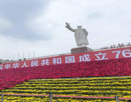 天府广场上,毛主席塑像巍峨矗立,广场中央“庆祝中华人民共和国成立76周年”的红色标语与缤纷花海交相辉映。站在这里,仰望伟人的手势,仿佛能听见历史的回响——正是一代又一代人的奋斗,才有了如今的盛世繁华。