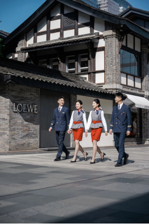 初夏的太古里,玻璃幕墙在阳光下泛着银灰色金属光泽,墙面上跳动着蓝紫色的光影。身着创意服饰的西航快闪队伍,一经登场,便引爆视觉焦点。