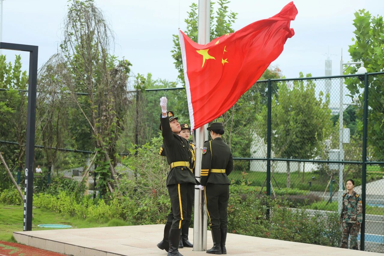 2025新生职场启梦训练军训汇报表演在雄壮的国歌声中正式拉开帷幕。全场师生肃立,向冉冉升起的五星红旗行注目礼,爱国情怀与航空报国之志在每个人心中激荡。