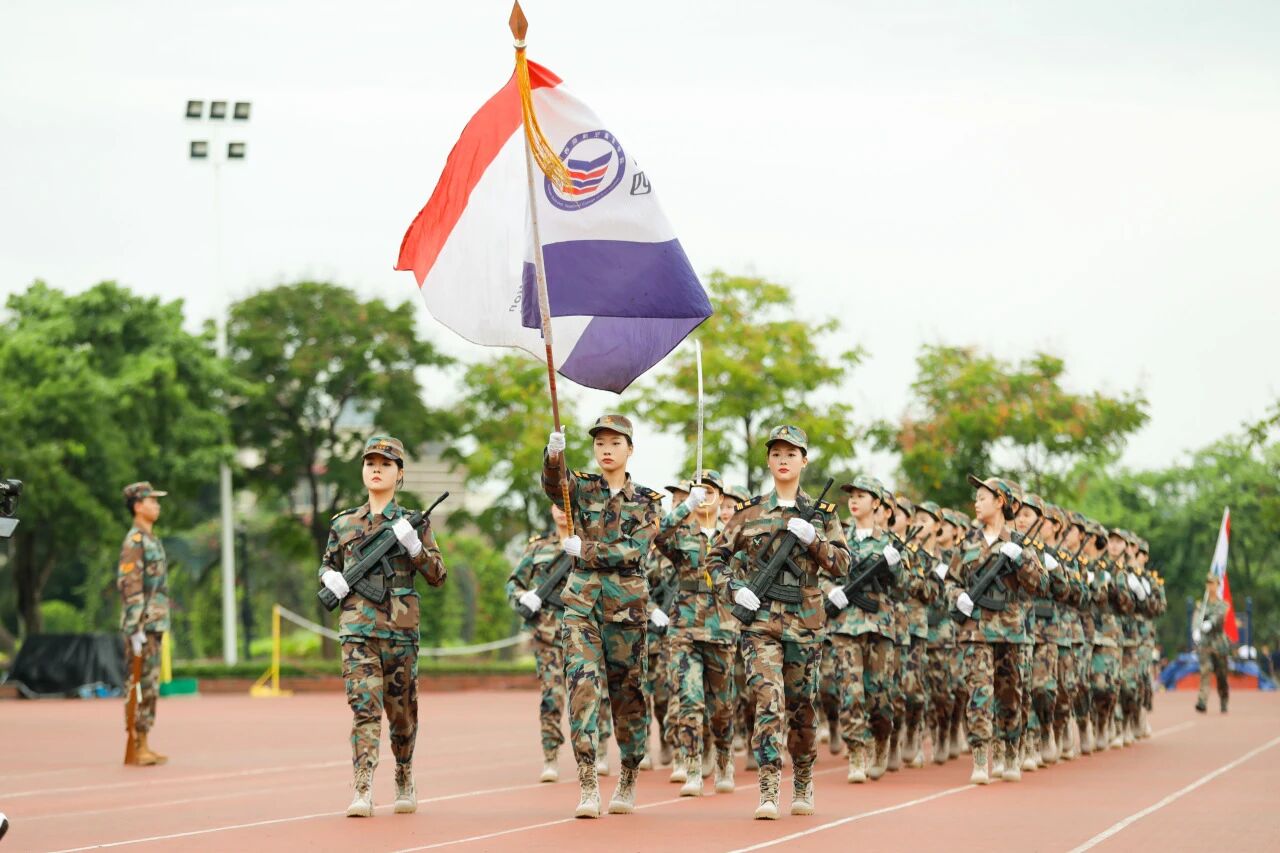 分列式正式开始时,近一个月的汗水凝成此刻荣光,伴着雄壮的军歌,各学院方阵迈着正步,踏过操场尽展青春朝气。