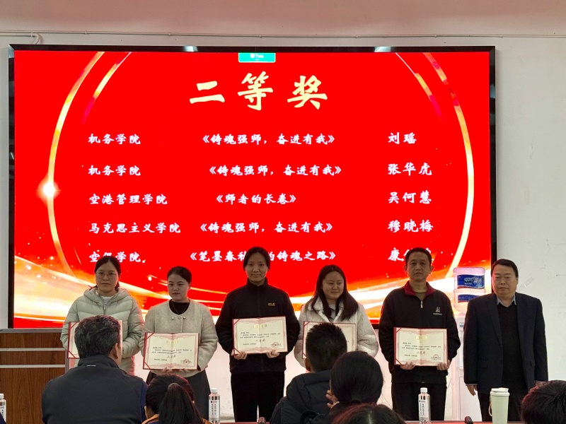 在隆重的颁奖环节,学院领导依次为获奖教师颁发荣誉证书。机务学院张宇轩,五专学院苏家林、杨雪梅,人工智能学院孙刘等4位老师荣获三等奖;机务学院刘瑶、张华虎,空港管理学院吴何慧,马克思主义学院穆晓梅,空保学院康钦俊等5位老师荣获二等奖;五专学院王娇娇、马克思主义学院黄晓丽、空中乘务学院刘领等3位老师荣获一等奖。全场以持续的热烈掌声,向获奖者致以最诚挚的祝贺与敬意。
