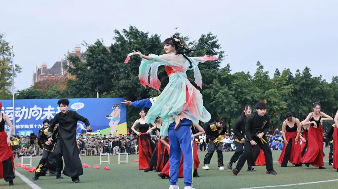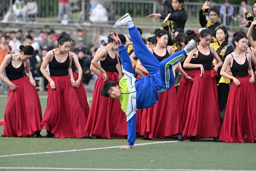 期间,机务学院的舞旗表演气势如虹,五彩旗帜在空中划出刚劲有力的轨迹,犹如蛟龙出海;中场时,街舞社团的《逍遥游》惊艳登场,将现代街舞的活力与古典韵律完美相融,展现了西航学子既能传承经典、又敢大胆创新的青春风采。