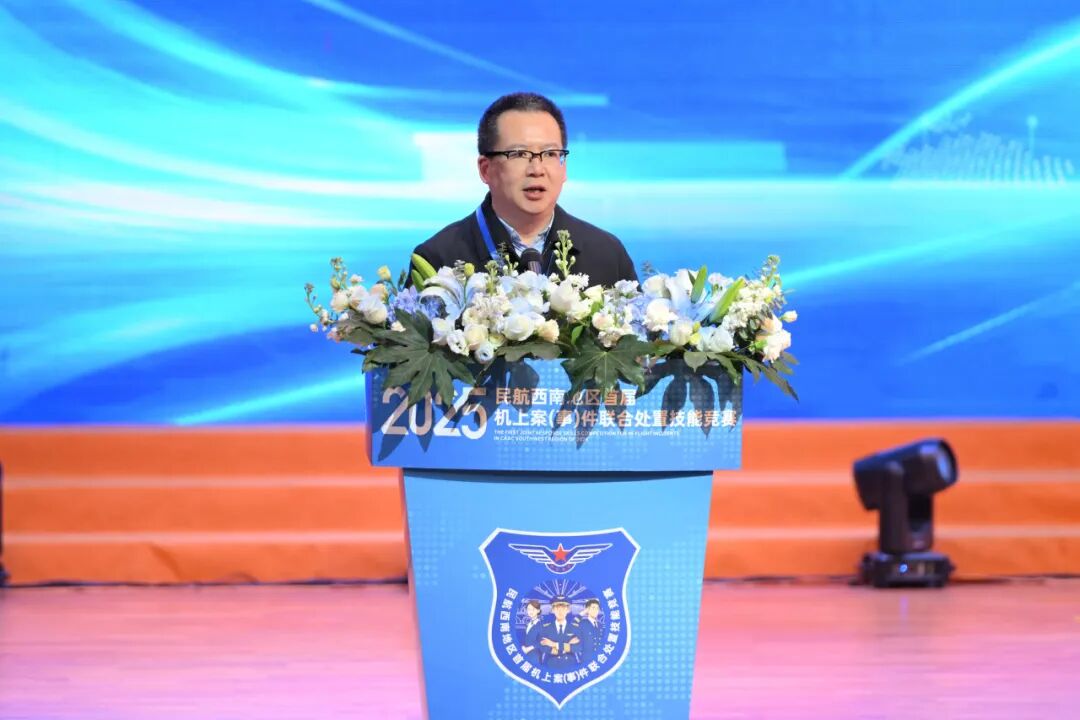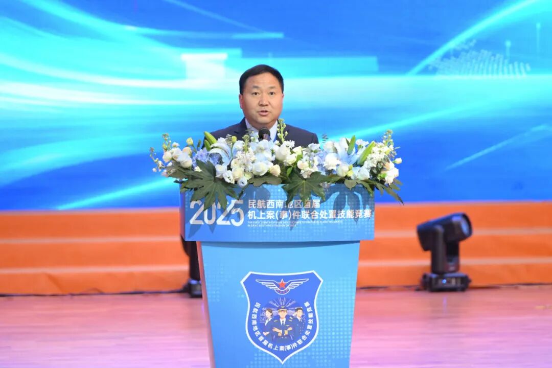 民航西南地区管理局副局长、总工程师李小虎发表重要讲话。他指出,空防安全是航空安全的生命线,直接关乎政治安全与国家安全。面对机上案(事)件类型多元、场景复杂的新特点,强化飞行、乘务、安全员三方协同联动,是形成处置合力、筑牢安全防线的关键。此外,他对全体参赛队员、裁判员及工作人员分别提出“赛出风格、赛出水平”“秉持公平公正”“精心服务保障”的希望,并号召以竞赛为新起点,共同筑牢西南民航空防安全的铜墙铁壁。