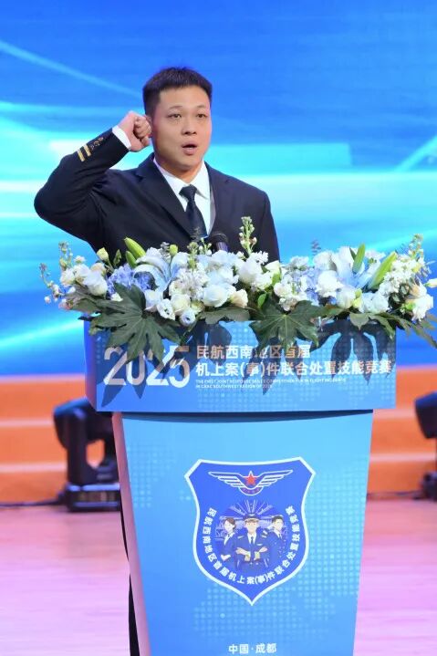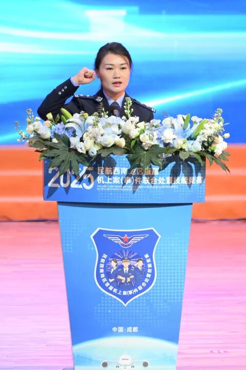 四川航空参赛选手马麟、四川监管局空防处阳岚分别代表参赛选手与裁判庄严宣誓。民航西南地区管理局副局长、总工程师李小虎,工会副主席吴澄,飞标处处长刘羽,公安局局长李黔,四川西南航空职业学院执行院长李玉龙共同启动了本次竞赛的开幕装置,正式宣布2025年民航西南地区首届机上案(事)件联合处置技能竞赛拉开帷幕。